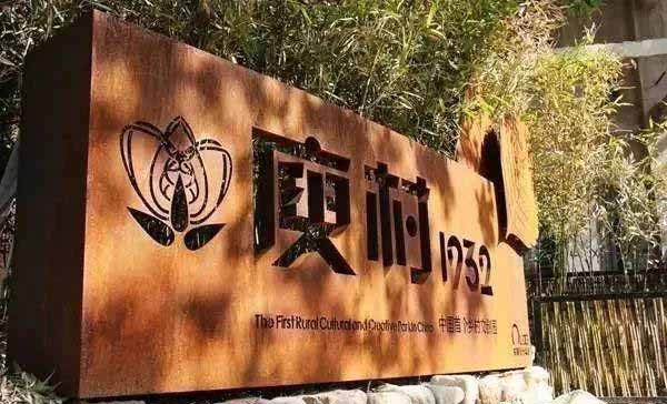 庾村,位于浙江德清縣莫干山的山腳下。村標采用銹板雕刻,符合了工業時代復古的氣息,并融合了鄉村的元素。