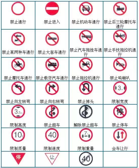 ③ 禁令標(biāo)志:通常為圓形,白底紅邊,紅斜杠黑色圖案。是根據(jù)街道、公路和交通量情況對(duì)車(chē)輛加以禁止或適當(dāng)限制的標(biāo)志。如禁止通行、禁止停車(chē)、限制速度、限制重量、限制寬度等。